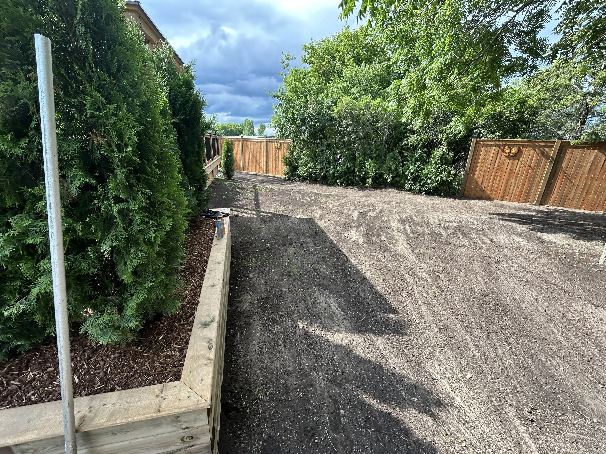 A backyard with a dirt surface, a wooden fence, and green trees. A raised garden bed with mulch and evergreen shrubs is on the left side, with a small tree in front of the fence. The sky is partly cloudy.