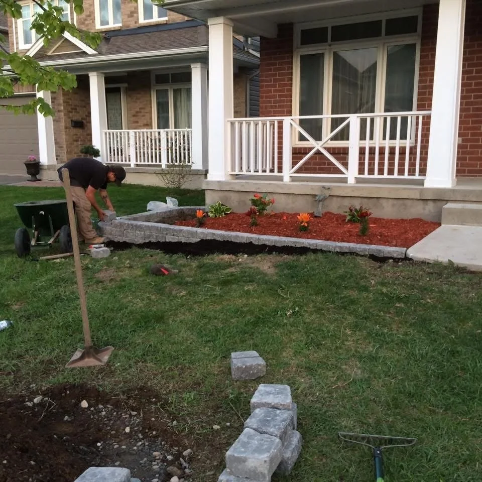Person working on installing a retaining wall in front of a house with a small flower bed and porch, surrounded by lawn and garden tools.