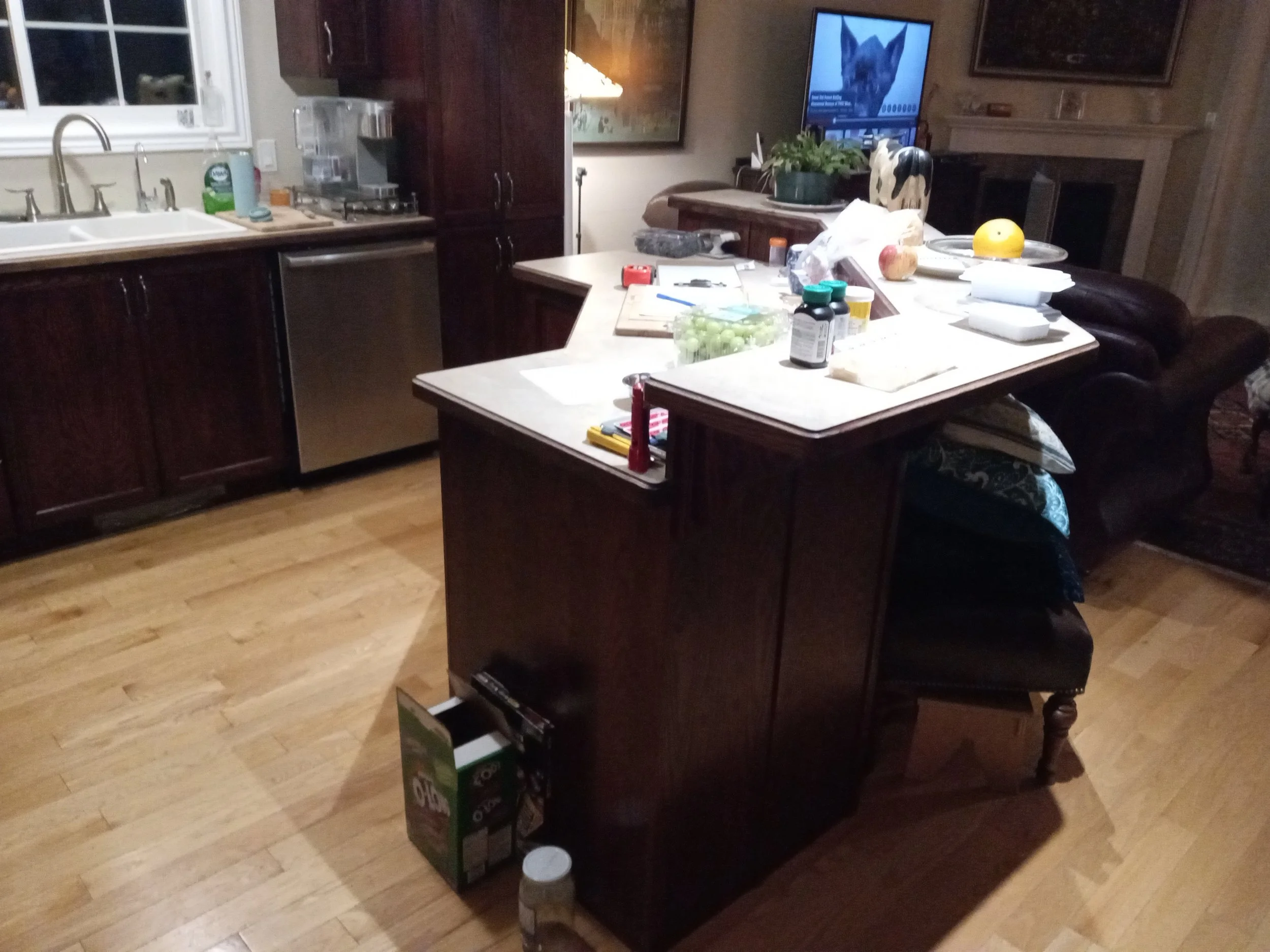 A kitchen with a wooden floor, a white countertop, and dark wood cabinets. The kitchen island has various food items and containers on it, along with some kitchen tools. There is a TV on the wall, a brown leather couch, and a fireplace in the background.