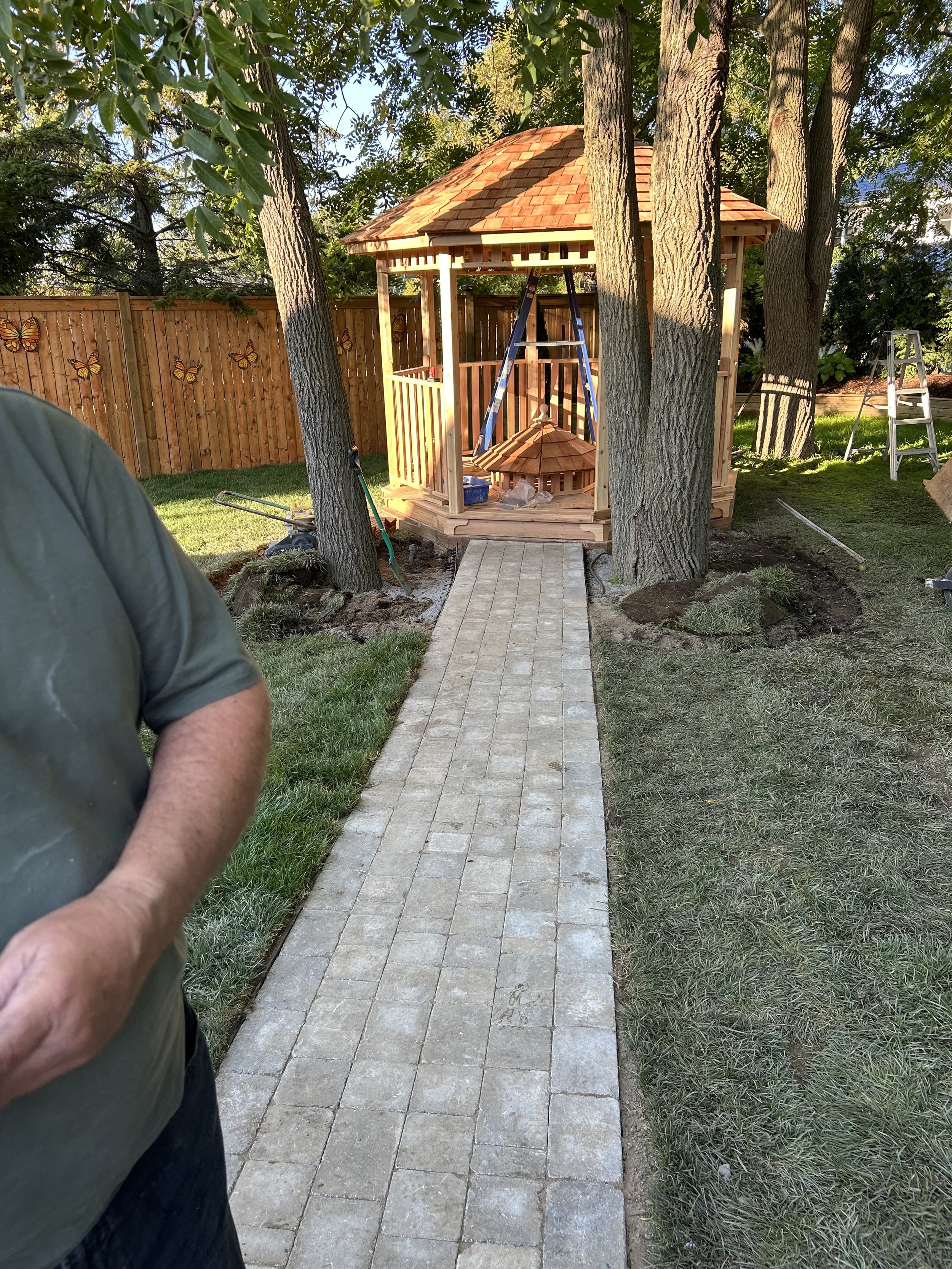 A backyard with a newly constructed wooden gazebo, a paved walkway leading to it, trees, a fence with decorative butterflies, a ladder, and some construction tools.
