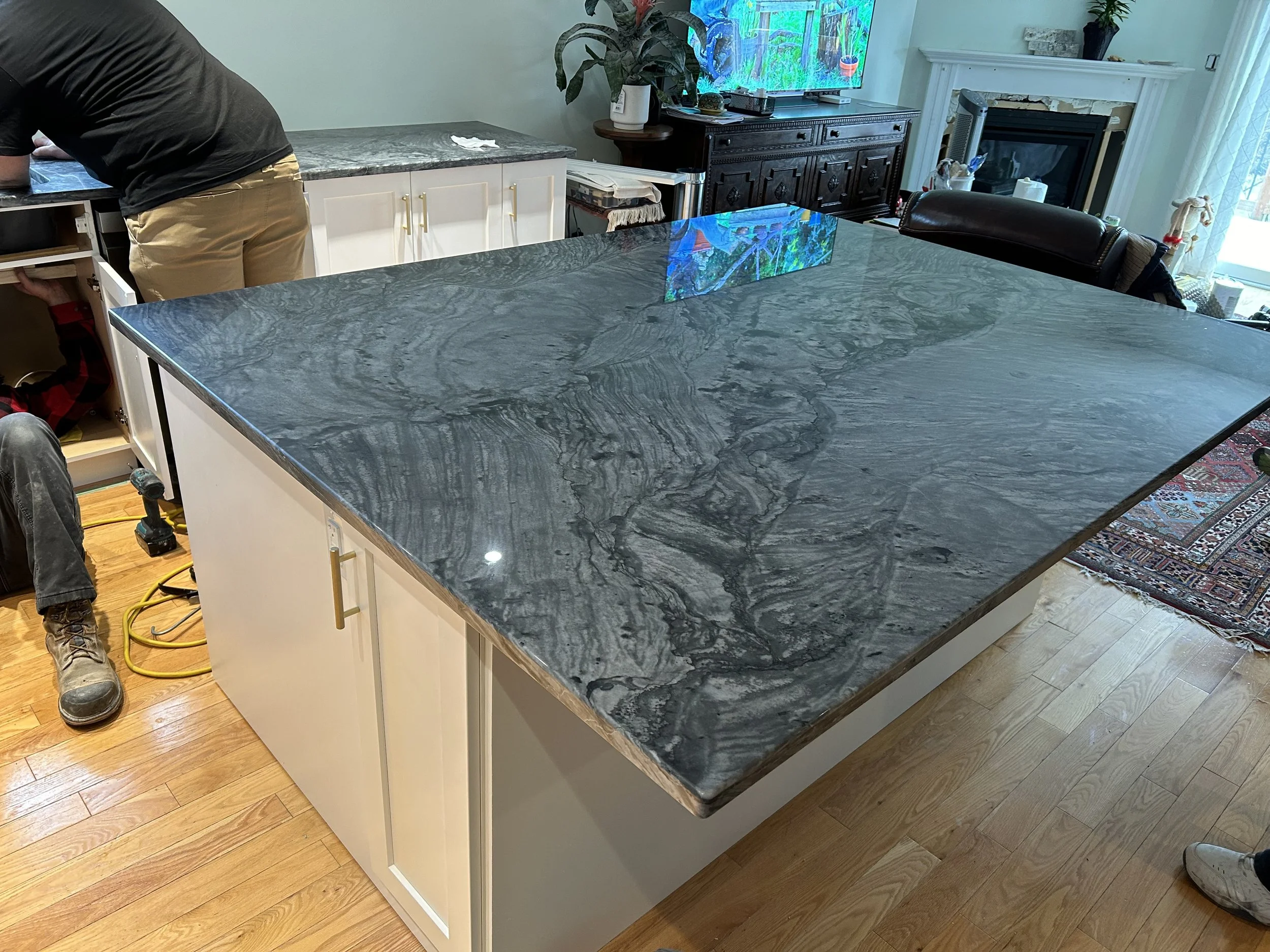 Close-up of kitchen island with polished dark gray marble countertop in a home interior.