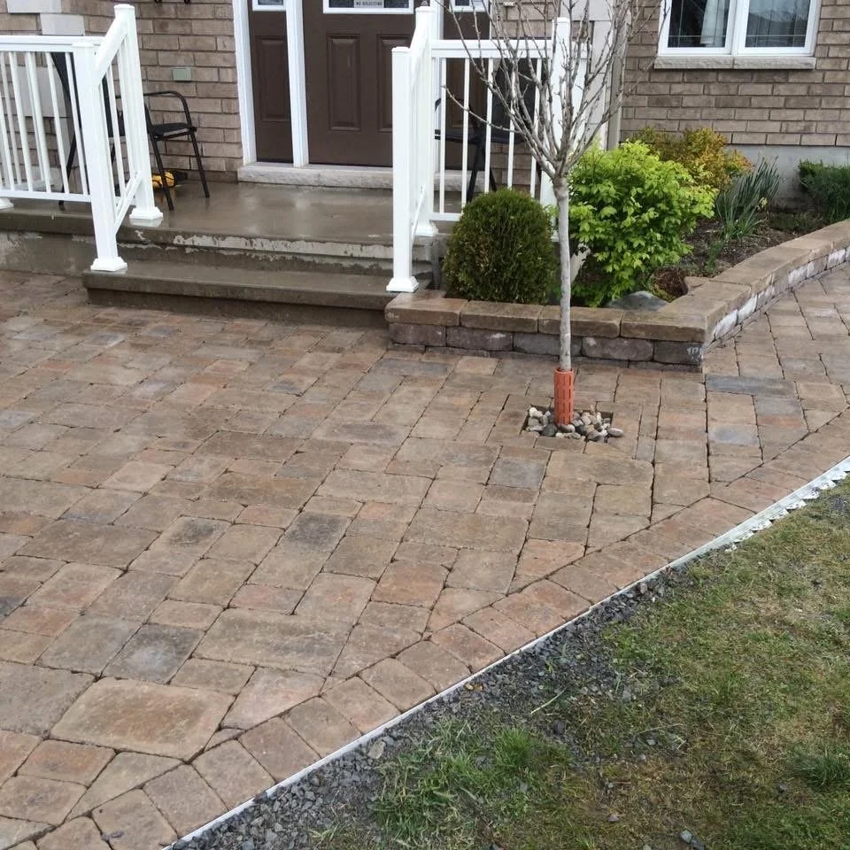 Paved brick walkway in front of a house with a small tree, bushes, and a raised brick flower bed. There is a porch with a railing and a front door.
