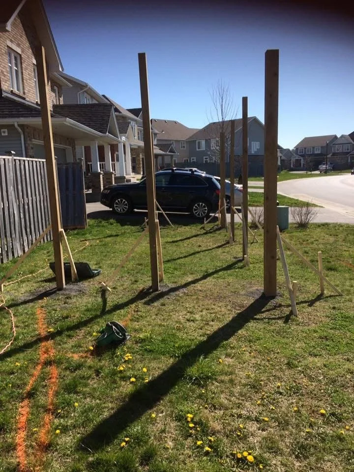 In the process of building a wooden frame, several vertical posts are installed in a grassy yard with tools and ropes around them. Residential houses and a parked car are visible in the background.